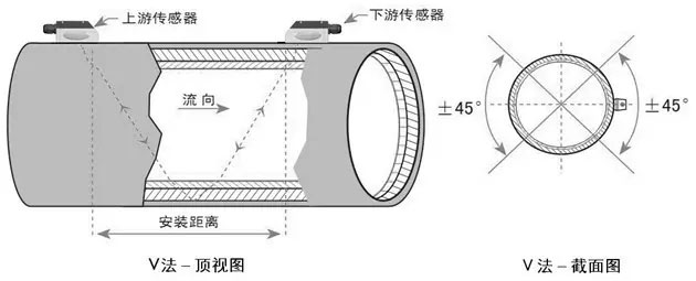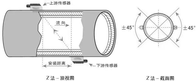 在遇到管道比較大,又比如說液體里面有著懸浮物、管到的內(nèi)壁結(jié)垢很厚或者襯里太厚這些因素,導致了我們使用V法安裝沒有信號,就沒法正常工作,這時候就采取外夾式超聲波流量計的Z安裝方法。Z安裝法的特征就是超聲波在管道中里直接進行傳輸,沒有反射就叫做單聲程,信號損耗就小。Z安裝法可以計量口徑范圍通常是DN100-DN6000。實際安裝時大于200的都應該用該方法來進行安裝。