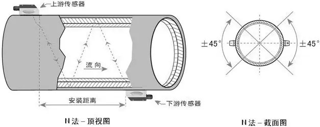 N安裝方式就是通過延伸超聲波的傳輸距離進行提升精度。用N安裝方式時,超聲波束在管道里反射兩次穿過流體三次(叫做三聲程),所以一般適于測量小管徑管道。